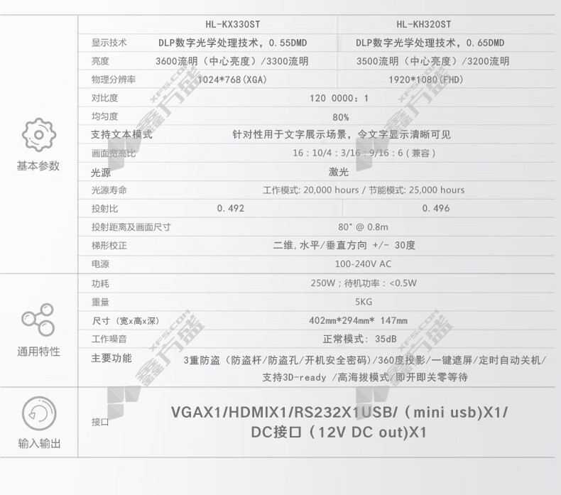 商品规格:HL-KH320ST/1920*1200/3500流明/白色