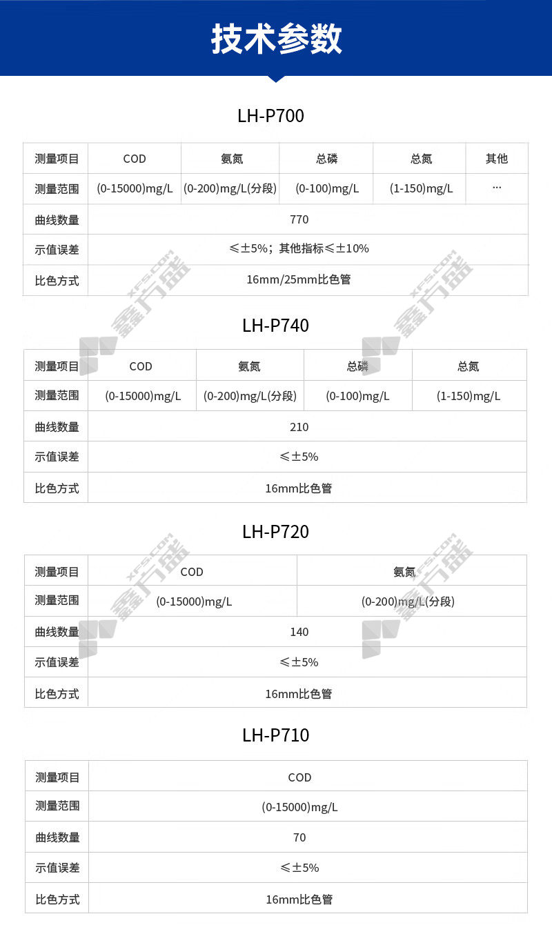 商品规格:LH-P700/C0D 0-15000)mg/L 氨氮 0-200mg/L(分段)/≤±5% 其他指标≤±10%