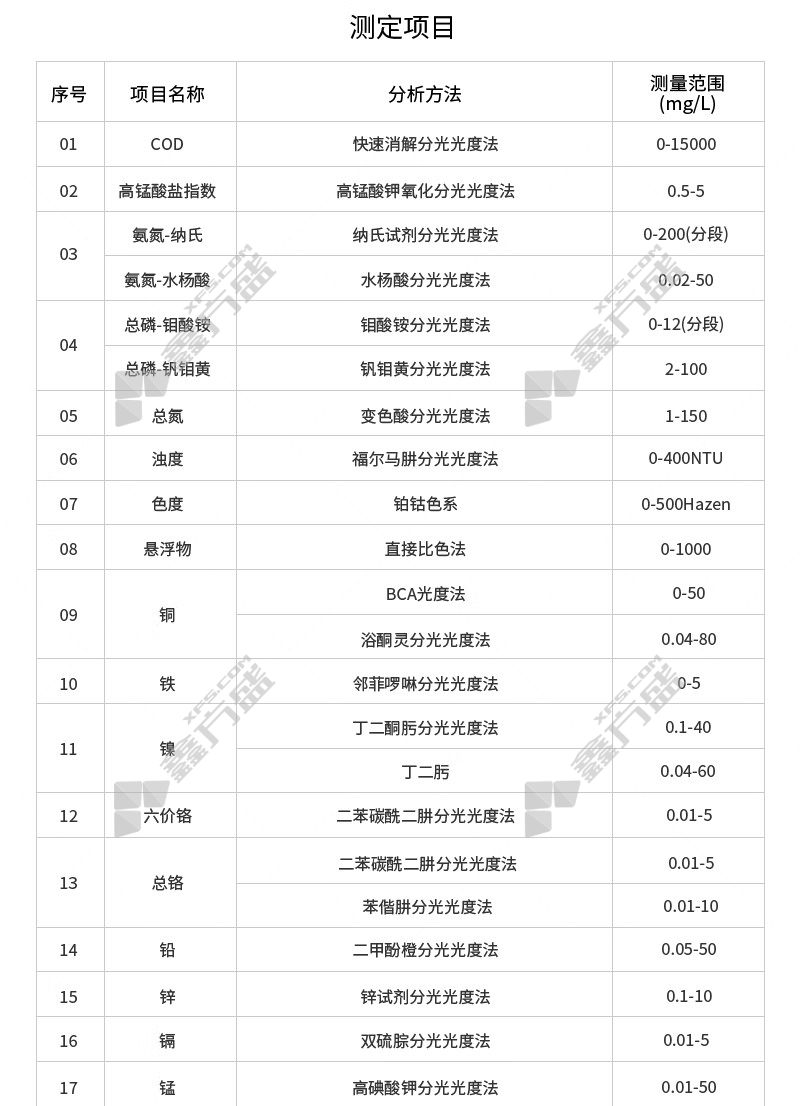 测量范围: C0D 0-15000)mg/L 氨氮 0-200mg/L(分段)